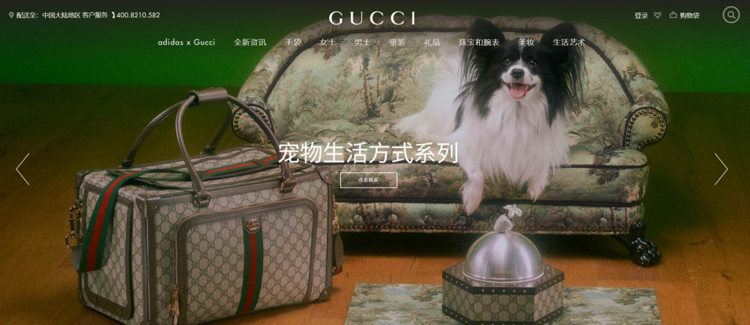 GUCCI对狗狗的诚意不只这些,定制了贵气满满的广告位。把官网的banner让出来,给阿猫阿狗猫做足了排面。不知道的,还以为是GUCCI拿下哪个新晋顶流代言,开始敲锣打鼓奔走相告。