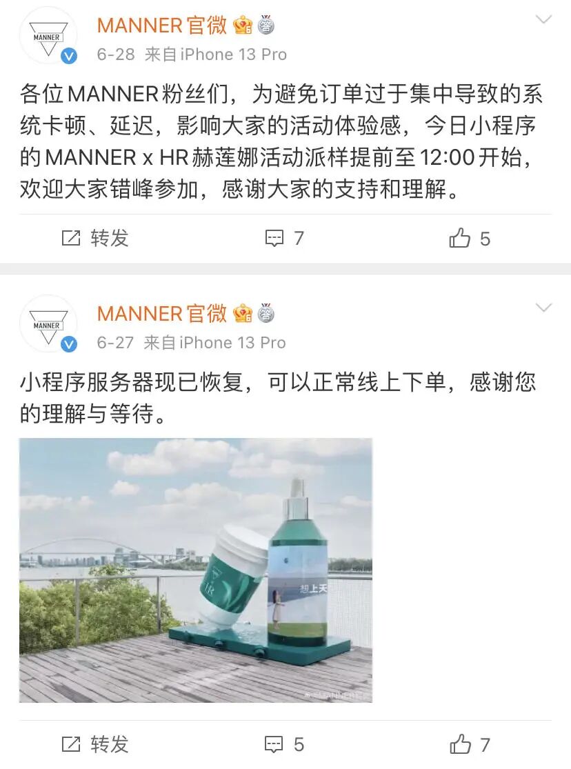 换包装,抽杯套,送赠品,发小样,这波联名让很多女生成功变身“赫莲娜女孩”,火爆的联名将Manner的小程序一度挤爆。