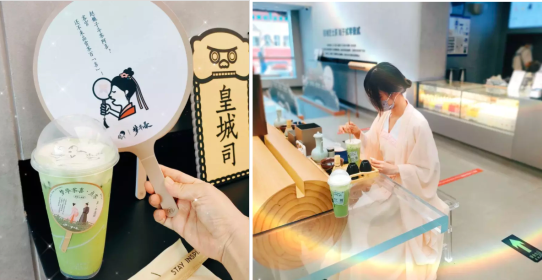 续借这种茶文化,喜茶推出了一波特有文化的联名,新品灵感来自电视剧中的紫苏饮子,芝士奶盖上有抹茶粉绘成的图案,与茶汤上作画的“茶百戏”传统技艺相呼应,还有几家体验感十足的主题店,让人直呼“穿越了”。