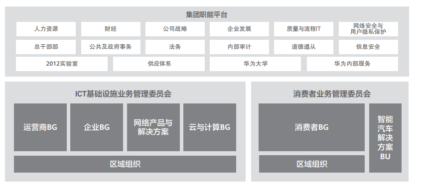 华为内部有两大业务管理委员会,分别为ICT基础设施业务管理委员会和消费者业务管理委员会。是负责业务战略、经营管理和客户满意度的责任机构。