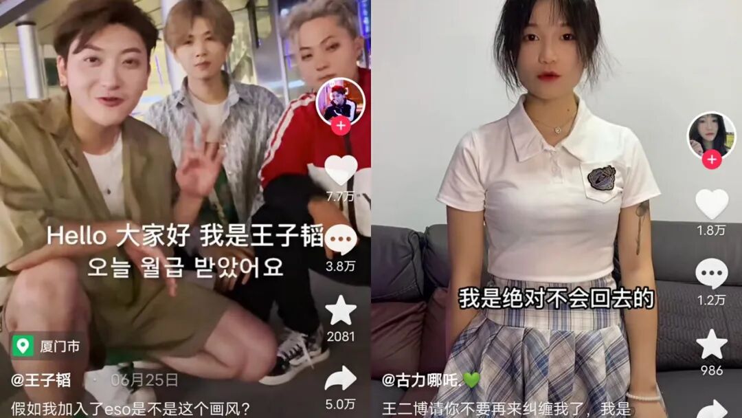 团员王二博塑造出了一个渣男人设,上演各种情感纠葛。他与ESO唯一女成员古力哪吒在一起又莫名其妙分手,之后女方发视频表示“分手了就不要纠缠”。这种博眼球、互相“喊话”视频的情感故事,来来回回千遍也仍然吃香。