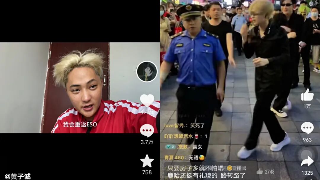 除了鹿哈,ESO里还有另外一位“流量担当”——模仿“咆哮版”黄子韬而出圈的黄子诚。今年年初,黄子韬直播时就有粉丝提及模仿者“黄子诚”,在看过视频之后黄子韬本人轻松回应“我觉得你还是要坚持做自己”。这个片段被黄子诚当作是明星本人“认证”的标志而置顶,目前视频点赞数也超过了100万。