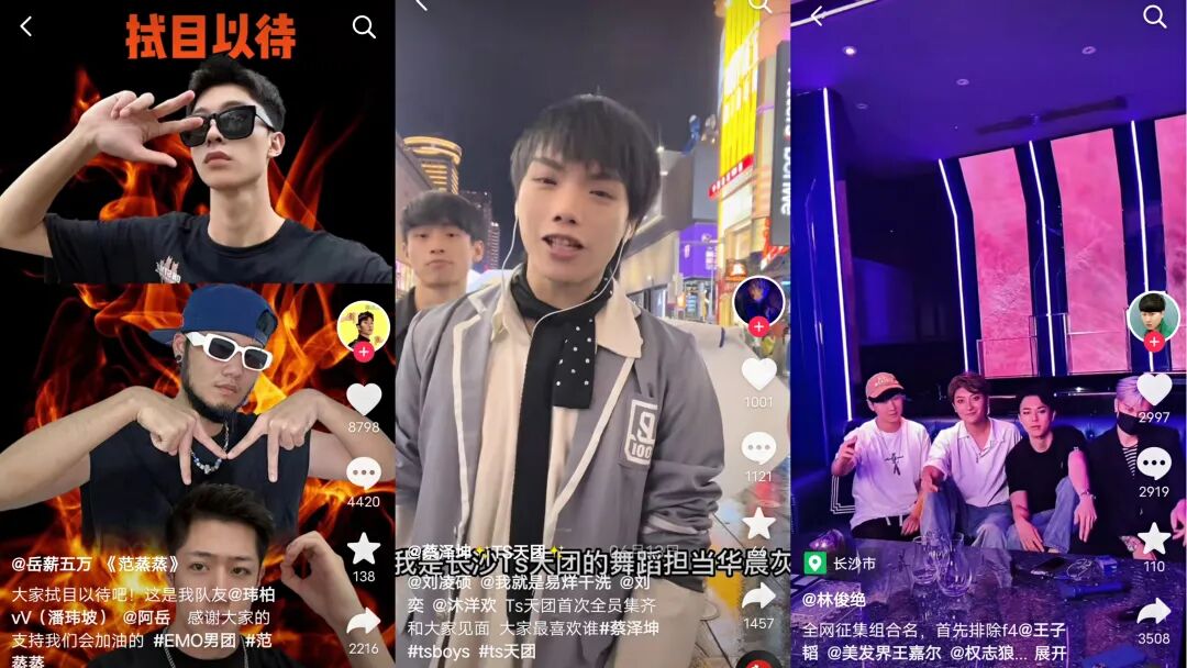 7月3日,EMO男团成立并快速发布了成团曲预告,成员包括范蒸蒸、潘玮坡、阿岳,从团体定位来看,EMO走的是“idol rapper”路线。7月8日,篮球担当蔡泽坤、舞蹈担当华晨灰、Rap担当易烊干洗(没错,身兼多职的他也在ESO)、颜值担当王源源、唱跳选手洋洋又组成了TS天团出道。