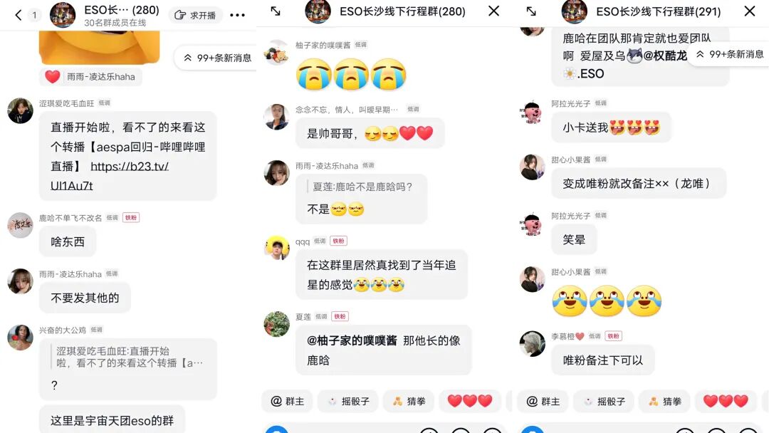 在291个粉丝组成的ESO线下行程群里,粉丝们希望团员开直播、空降聊天,收到回复也会像被“翻牌子”一样激动;有人在群里转发了一条不相关消息,立刻就有铁粉出来彰显主权:“这里是宇宙天团ESO的群,不要发其他人。”最新一期成员合体视频里,ESO六位成员身穿黑色打歌服,单膝跪地喊着应援口号,评论里是熟悉的团粉与唯粉的口头大战。