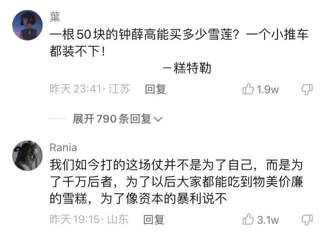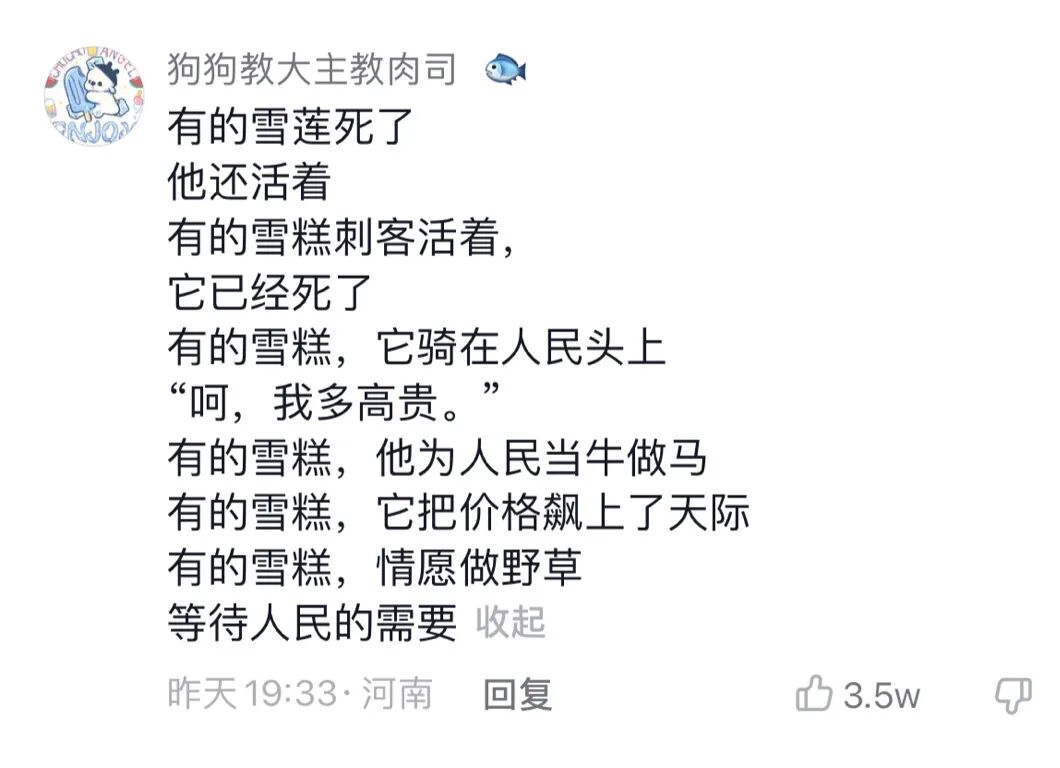 疫情之下,大众对资本的愤怒达到了更高点,当雪糕刺客扼杀了人们的雪糕自由,像雪莲这样的平价雪糕品牌就成了平民大众的拥护者,并用文学创作宣泄情绪。