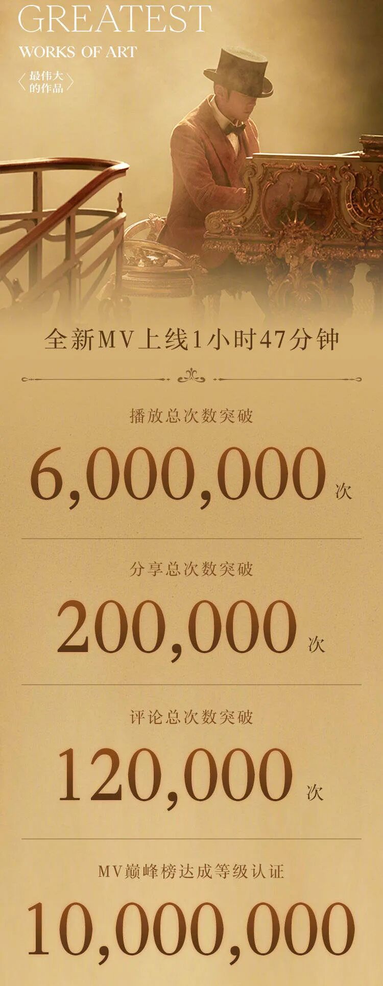 数据统计,上线不到两小时,该MV播放总次数就已经突破了600万,评论总次数超12万,MV巅峰榜达成1000万等级认证,各项纪录都打破了QQ音乐MV单日数据的历史纪录。
