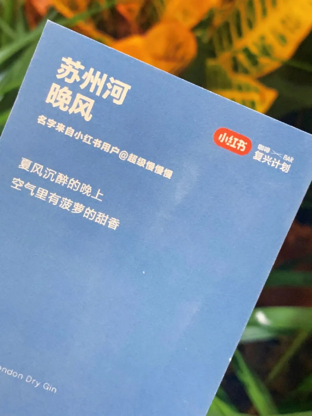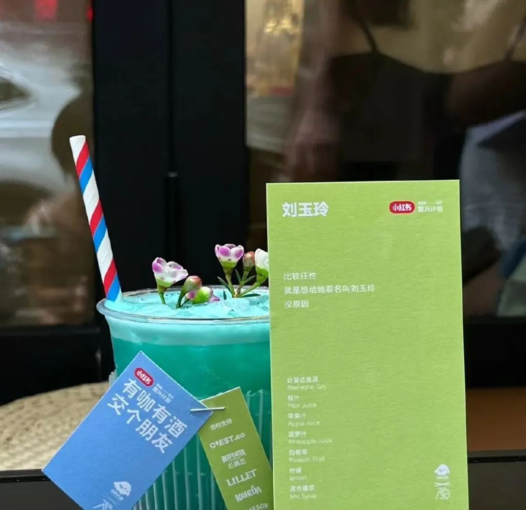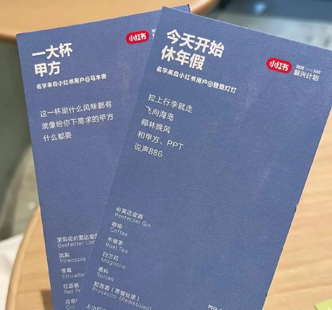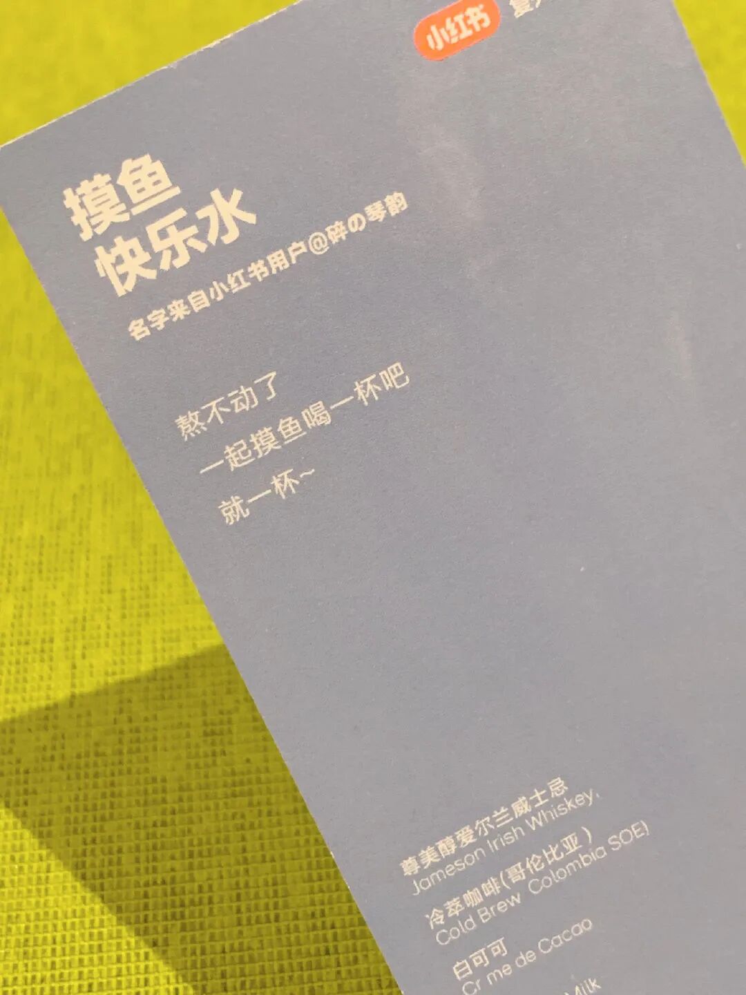 杯子、酒卡、贴纸也很有新意,每张酒卡上都带有特调的名称和寓意,摸鱼快乐水、一大杯甲方、三个菠萝开派对......每一款特饮名字和灵感,都是出自小红书用户,人均创意大师没错了!