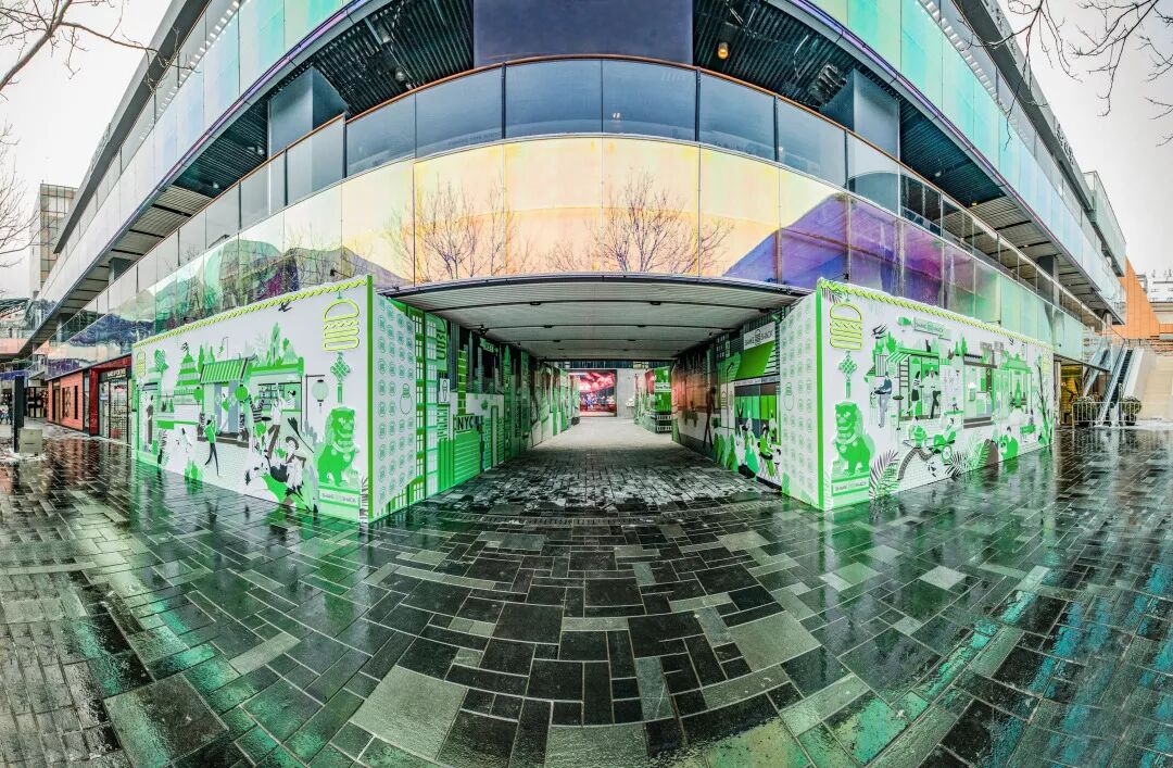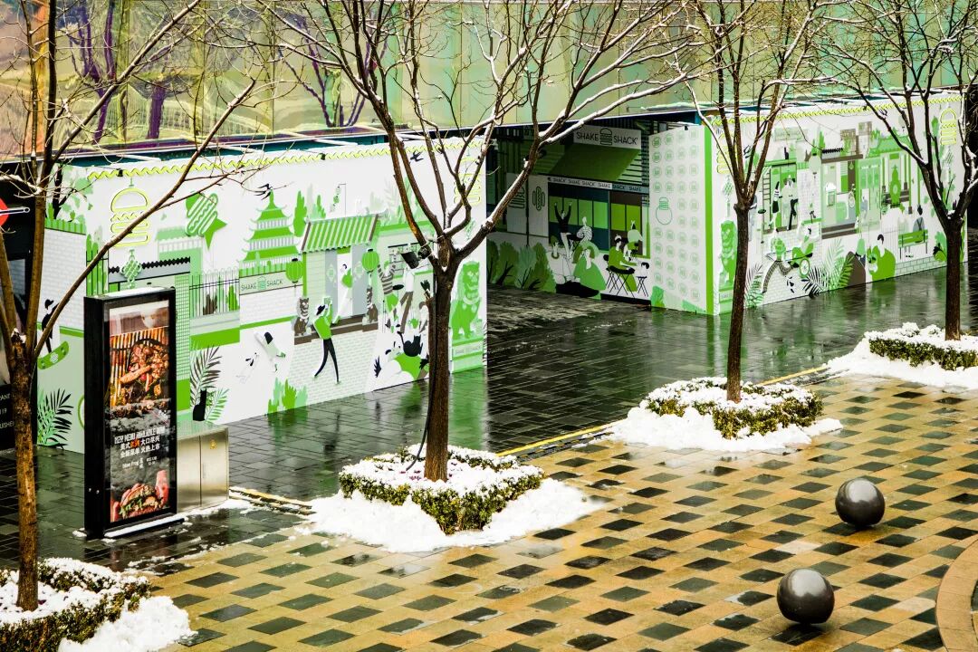 青年创作艺术家于㻛将 Shake Shack 北京三里屯门店外围围挡作为载体,创造出超过 440 平方米的巨幅沉浸式体验艺术画作“Shake Shack胡同”。