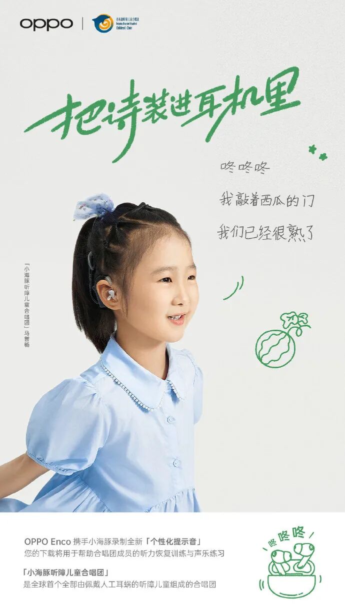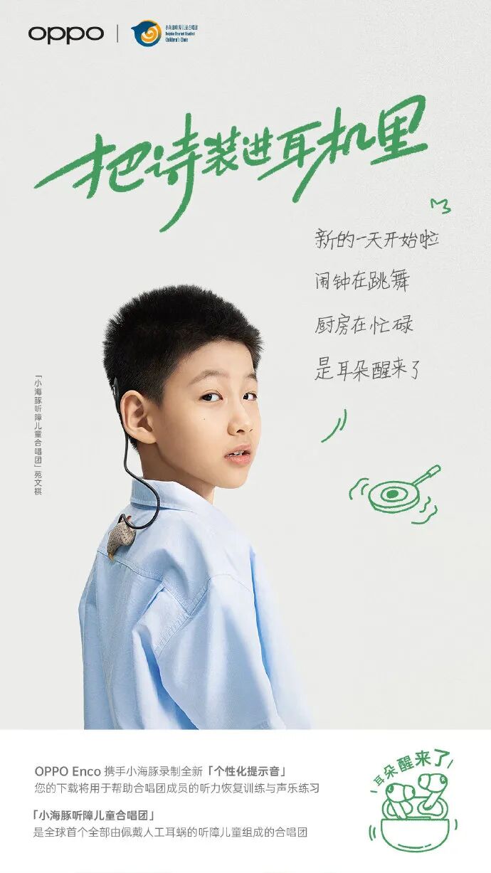 OPPO用诗歌对话听障儿童,为他们搭建发声舞台。将孩子们念诗歌的声音制作成耳机的个性化提示音,打造专属语音包,让更多的人听见「小海豚」的声音,唤醒大众对听障群体的关怀。