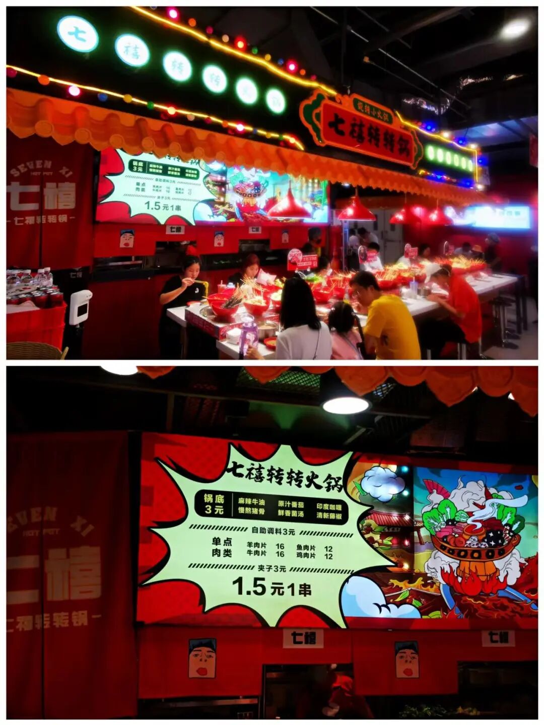 另一家店是位于长楹天街负一层的“七禧转转锅”,类似于“串串香”的模式,“1.5元/串”+“3元/位”的锅底,其他如牛羊鱼肉类则需单点,整体人均在20-30元,午市上座率大约有六成,晚市需排队。
