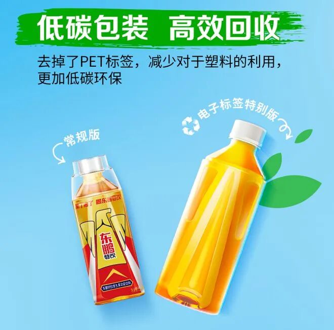对于数以亿计的可口可乐来说,900个显然营销意义大于环保意义。今年4月,可口可乐的老对手百事推出国内首款“无瓶标”装百事可乐也曾引发热议。彼时,百事将300ml迷你瓶装原味可乐进行了包装调整。“无瓶标”减少了瓶身塑料标签及瓶盖上的油墨印刷,作为替代的是浮雕式的品牌商标及产品名称。当时借由百事代言人蔡徐坤的上市活动,也创造了一波流量明星+环保营销的不小热度。同样是今年,国内饮料巨头康师傅也加入了“瓶身”环保热潮。发布首个以低碳环保理念的无标签PET瓶包装,应用于其经典产品柠檬味冰红茶与无糖版冰红茶。新包装将产品名称和生产日期等基础信息通过激光打印技术雕刻于瓶身,以减少瓶身塑料的使用。其实除了这三家巨头,达能脉动发布了全球首个“智慧碳”概念瓶,安慕希发布减墨装产品,金典直接发布了无印刷无油墨环保包装,东鹏特饮则上线了国内首款电子标签功能饮料......但纵观饮料界在包装上的“环保”动作,多数都是依托于世界环境日、公益活动等特定时间节点的营销行为,并非一种常态化的、大规模投入使用的商业行为。对比此次可口可乐官宣雪碧“自废武功”在整个北美地区放弃经典“绿色”包装。虽然可能并非“主动”,但根据可口可乐发布的公告——此举将比2019年使用的塑料垃圾减少2000万磅的现实结果来看,环保的效果也确实达到了!03