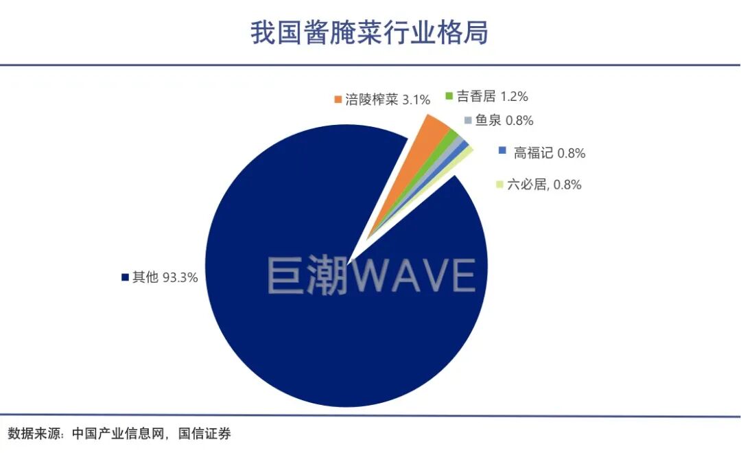 拓展产品品类,由榨菜赛道扩展到大的酱腌菜行业,无疑是一条顺理成章的成长路径。这也是不少投资机构看好涪陵榨菜未来发展的重要原因。从行业竞争格局来看,目前酱腌菜行业CR5份额不足6%,涪陵榨菜份额也只有3.1%,有着巨大的成长空间。
