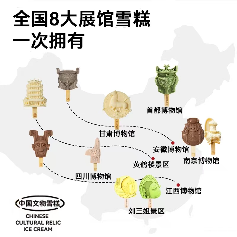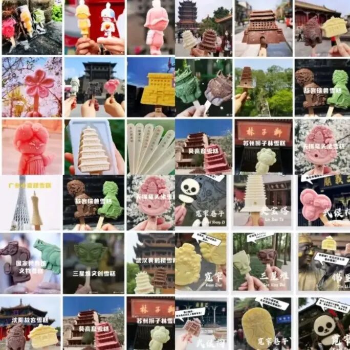 故宫的脊兽雪糕、中国国家博物馆的说唱俑和云纹犀尊雪糕、上海博物馆大克鼎雪糕、沈阳故宫紫气东来雪糕、敦煌莫高窟雪糕……