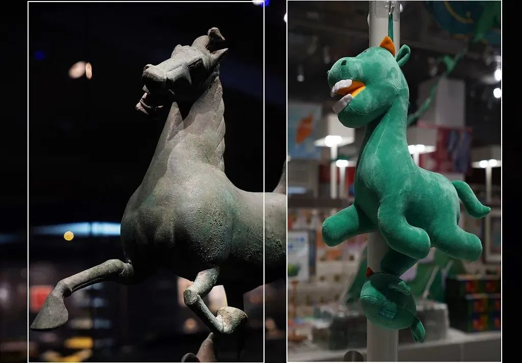 (左:铜奔马正面图;右:甘肃博物馆文创产品——铜奔马毛绒玩具)