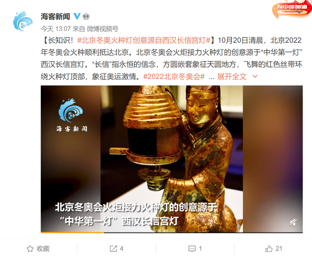 2022年北京冬奥会上的火炬接力火种灯的设计创意,就借鉴吸收了西汉长信宫灯的文化元素,长信宫灯是河北博物院馆藏的国宝,美好寓意更是助力冬奥。