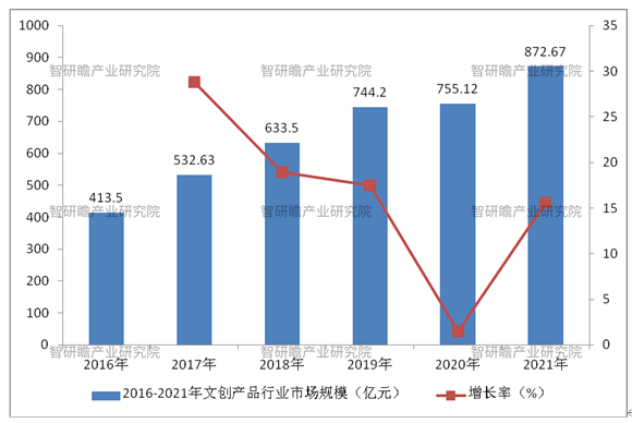 据统计,2016年中国文创产品行业市场规模413.50亿元,到了2021年中国文创产品行业市场规模872.67亿元,同比增长15.57 %。