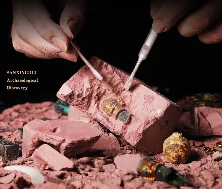 三星堆博物馆有“桌面考古盲盒”,消费者需要用小锥子和小刷子,模仿真实考古的步骤,把宝藏从土块中轻轻挖出来。