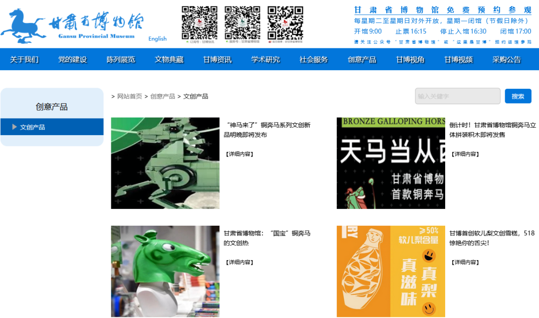 虽然马踏飞燕火了,但在故宫博物院已经可以凭借文创产品营收远超门票收入时,2020年甘肃博物馆的90%收入都来自经费拨款,打开甘肃省博物馆官方网站,质朴感扑面而来,看上去丝毫没有打开年轻人钱包的意思。