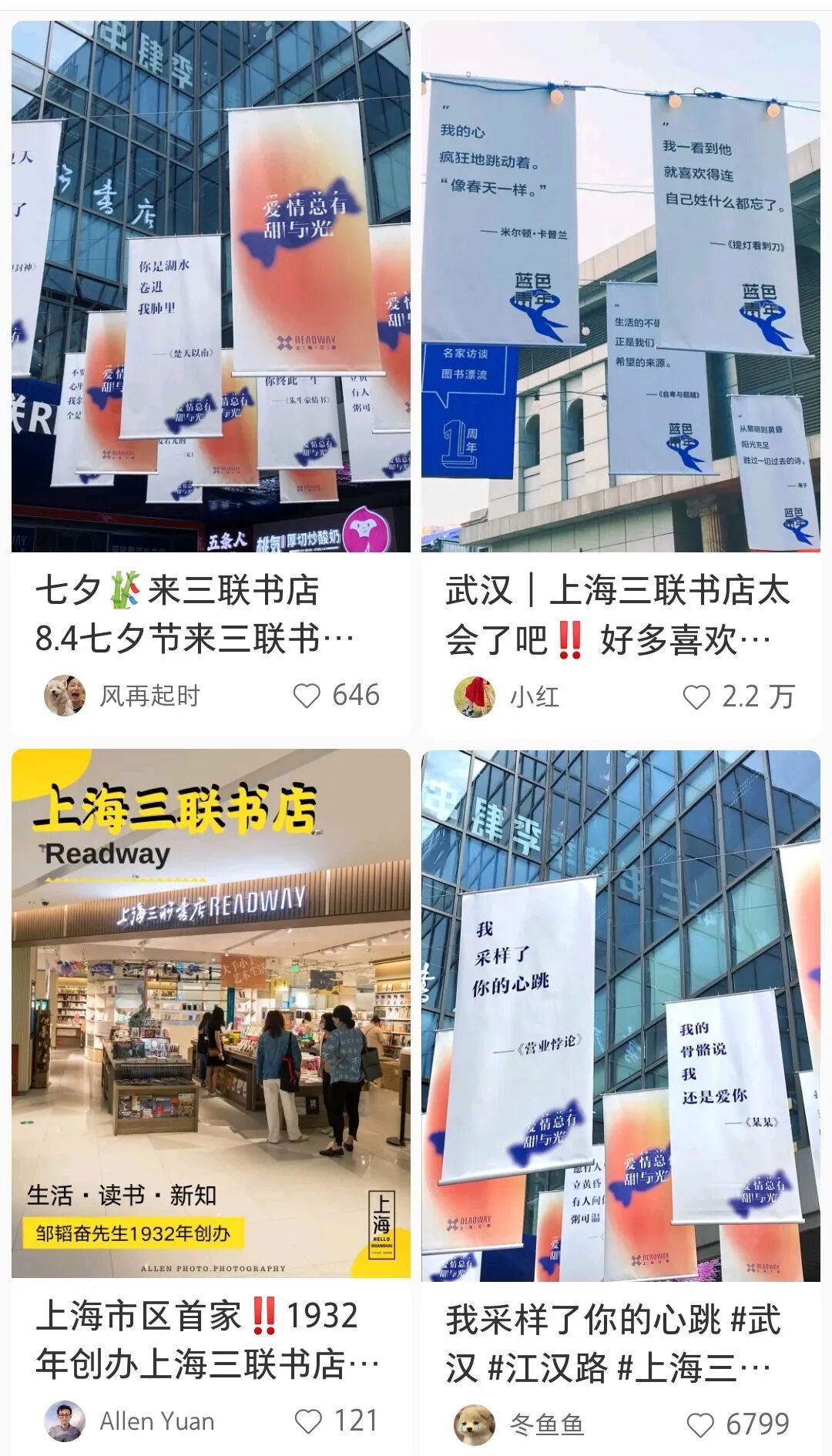 这不,刚刚过去的七夕,开在武汉的上海三联书店就在自己店门口做了一个应节宣传,以书籍为载体,以文案为内容,低成本做了一个类城市快闪限时展。