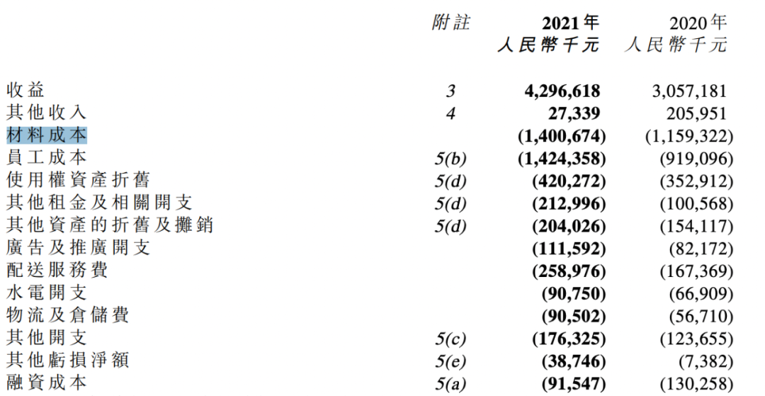 2021年年报显示,奈雪的茶原材料成本为14亿元,占收益的比重达到了32.6%,同比增长20.8%,是继员工成本外,集团第二大的成本支出。这其中,包括茶叶、乳制品、时令水果、果汁以及其他原材料。