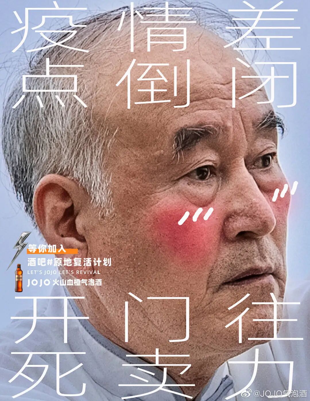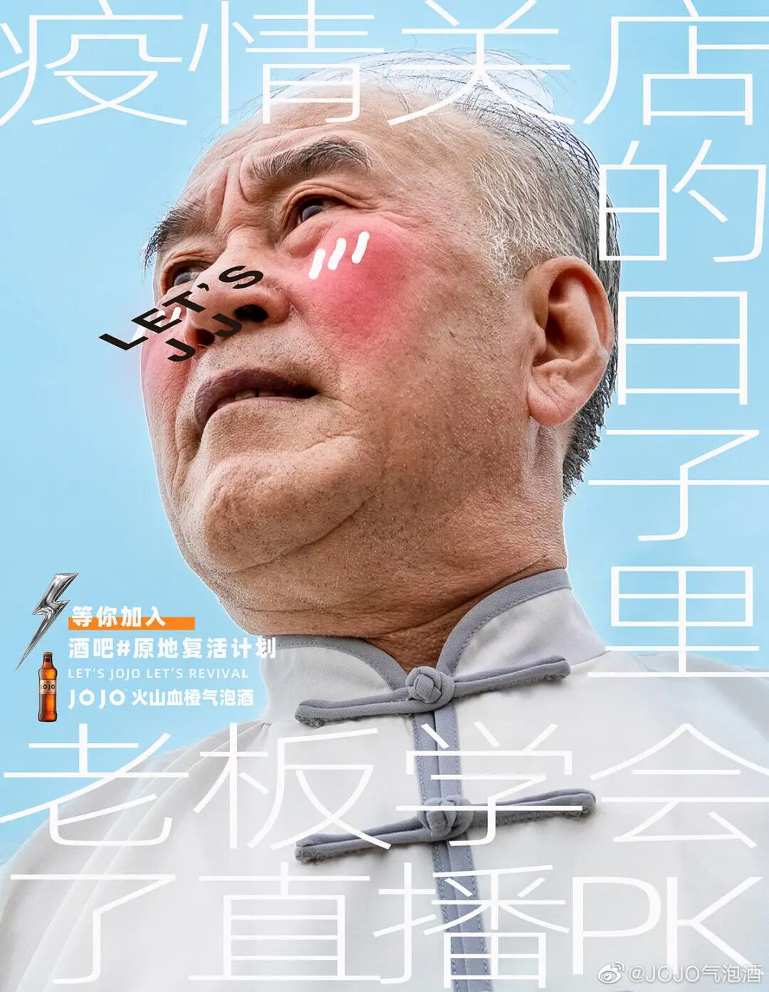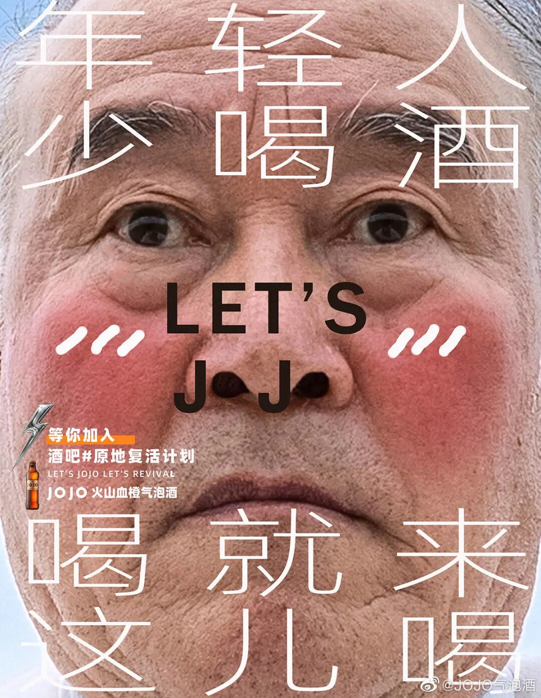 除了这组海报,此前JOJO气泡酒还找来一位爷爷拍摄了一组文案海报,以一个长辈严肃且不失幽默的风格表达对于饮酒的建议。满版海报上大爷卖力演出,用两个“鼻孔”呈现品牌Logo,这反差萌真真是绝了。