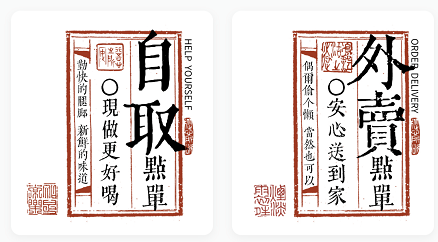 这种文艺古风的设计,细致到小程序“自取”和“外卖”的选项中,通过红黑色以及书法字体的搭配,极具品牌特色。