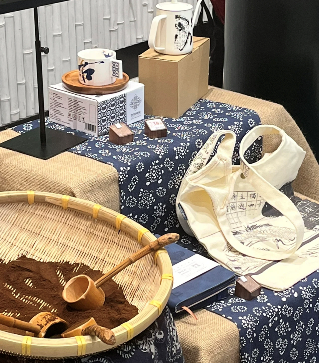 而店内展示产品原材料咖啡豆,也是采用了中式小簸箕装着,极具中国特色。