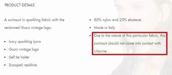 但这件泳衣,GUCCI官网给出的建议中有一条写的是:“避免接触氯”。