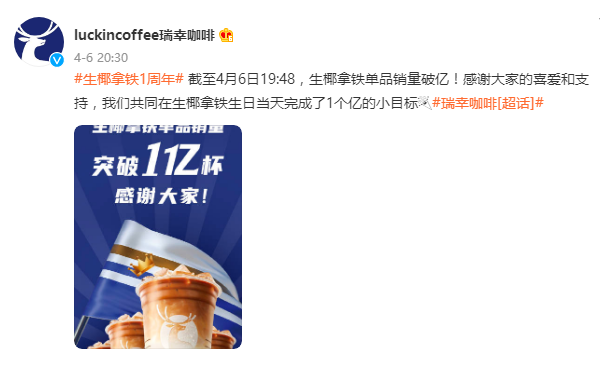 前段时间瑞幸咖啡官微发布了一组数据,仅一周年时间,生椰拿铁的累计销量就已突破了1亿杯。