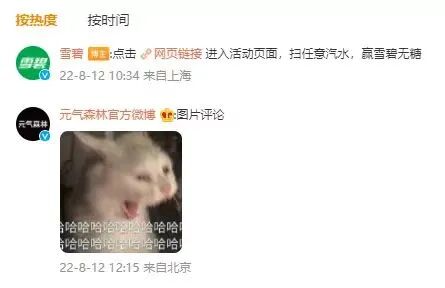 熟稔互联网营销之道的元气森林,不但第一时间跑到雪碧官微的评论区以图片文字“哈哈哈哈哈哈……”调侃互动,带动气氛。