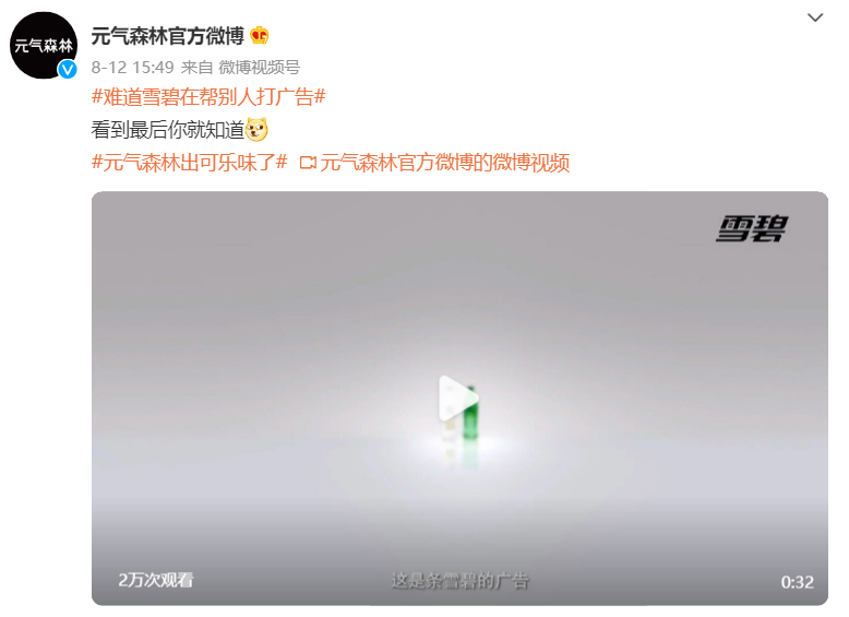 更巧合的是,雪碧创意视频上线的前一晚,元气森林可乐味苏打气泡水已正式上线天猫及京东旗舰店,雪碧换装之后这波的热度,完美被元气森林截胡。