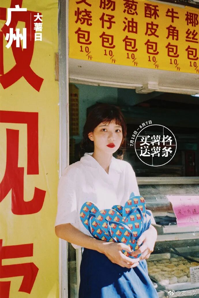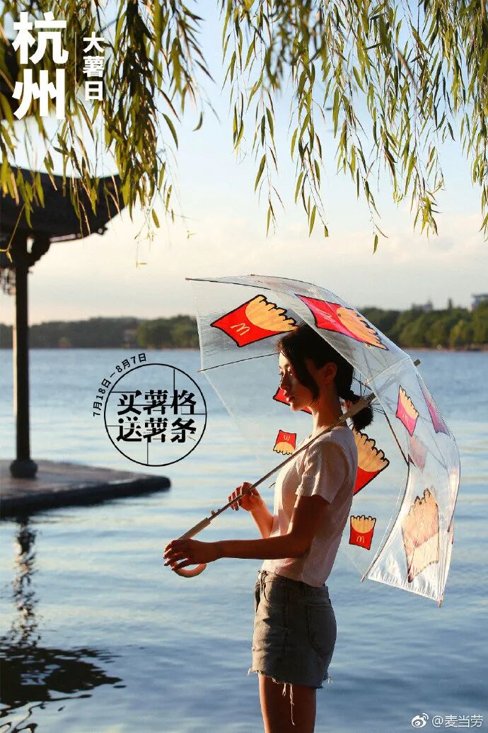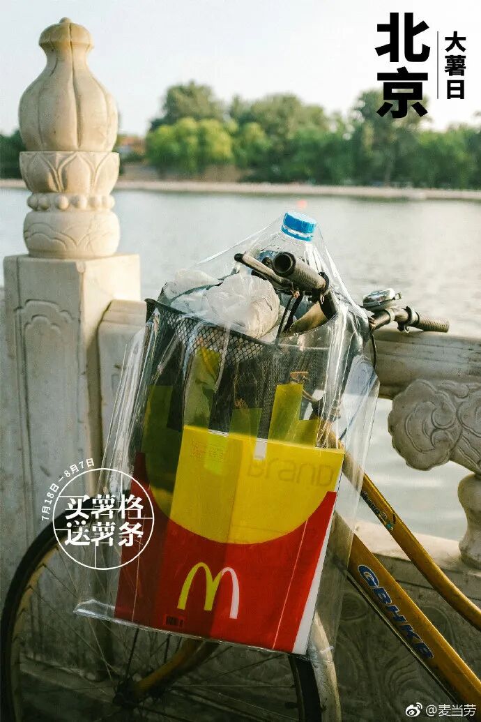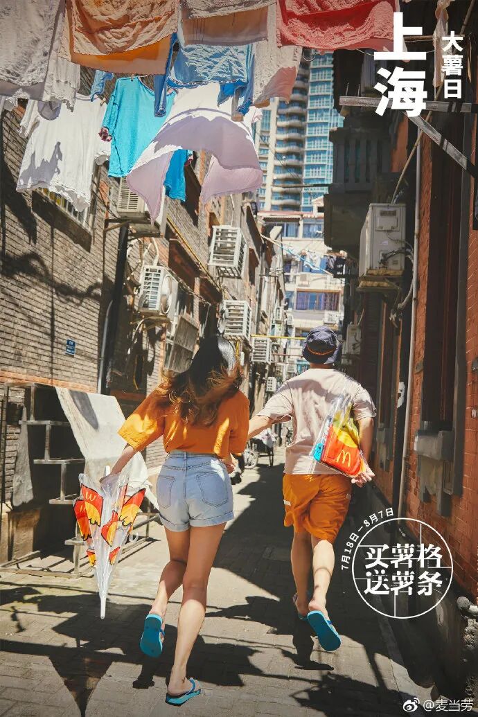 2018年,麦当劳“大薯日”活动上新了薯条手袋、雨伞、人字拖这三款限量周边,为了宣传活动也发布多个城市海报,展现不同的消暑方式。各个城市的特色元素和典型地标建筑,加上麦当劳的周边宣传,给不同地方的用户带来满满的归属感。去什刹海划船,吃着冰棍儿在胡同口坐坐,老北京最地道的消暑方式。伸出窗户的晾衣杆,跑不到头的老弄堂,阳光穿过梧桐洒下满街斑驳,这是上海夏天的模样。串串最好的时刻,在夏天的热锅里;夏天最好的时刻,在成都的街头里。西安的夏日记忆,是新鲜扑面而来的早市,是凉爽穿堂风的城门洞。穿上薯条凉拖去过早,老汉口消暑好虚浮。