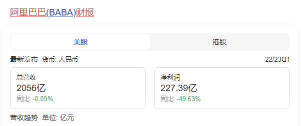 阿里在自然年2022年二季度财报中披露,营收达到2055亿元,基本实现持平。同期,净利润为226.59亿元。