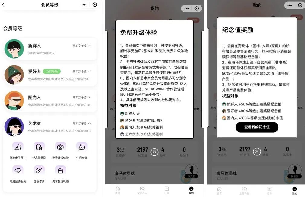 在「海马体」的会员体系中,一共分为“新鲜人”、“爱好者”、“圈内人”、“艺术家” 4 个等级。用户累计消费到一定次数后,会员等级就会上升,享受到更多的权益。