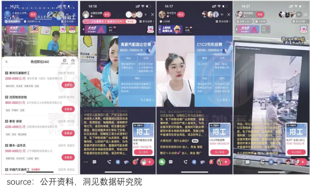 可以看到,快招工上这类小企业自播,或中介带岗2-3个企业的中小直播间,数量庞大。