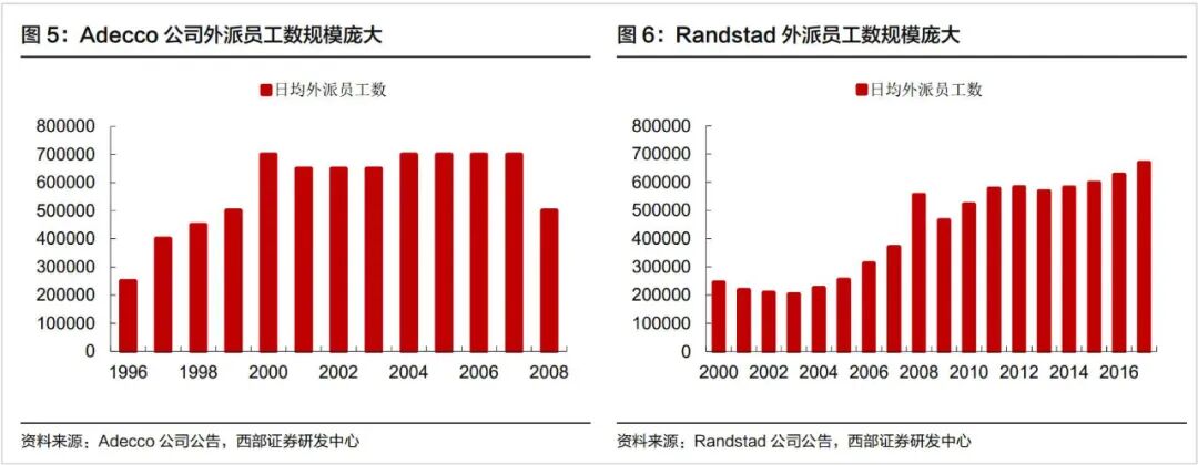 而这种模式,需要平台对客户的需求快速响应。如下图,国外的劳务机构Adecco、Randstad等,日均外派灵活用工数量高达近70万。