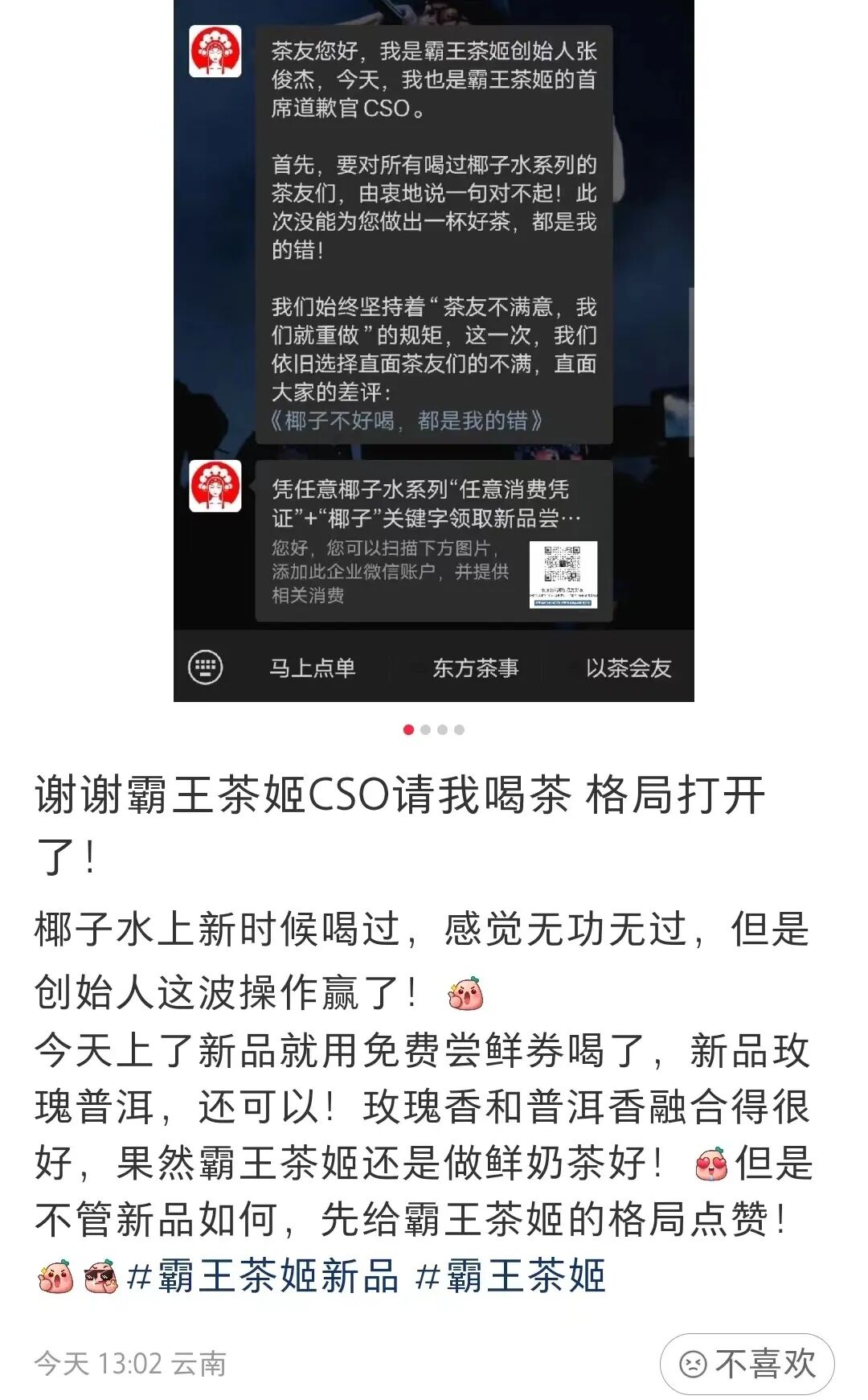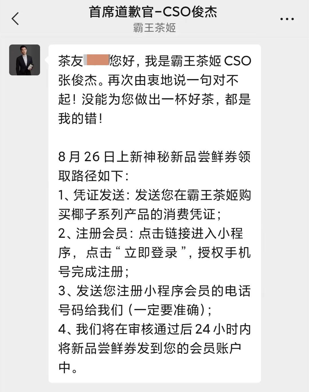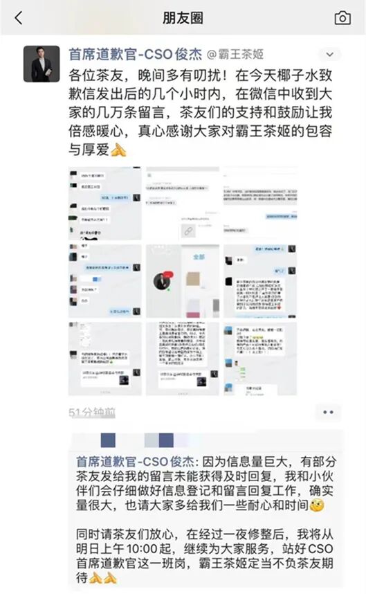 CSO首席道歉官张俊杰则承担了持续跟进的重责。24号晚上11点左右,他通过朋友圈跟进此事,表示在致歉信发布的几个小时内,就收到超过10万条留言,正在持续做信息登记、留言回复和补偿发券的工作,感谢大家对霸王茶姬的包容与厚爱。