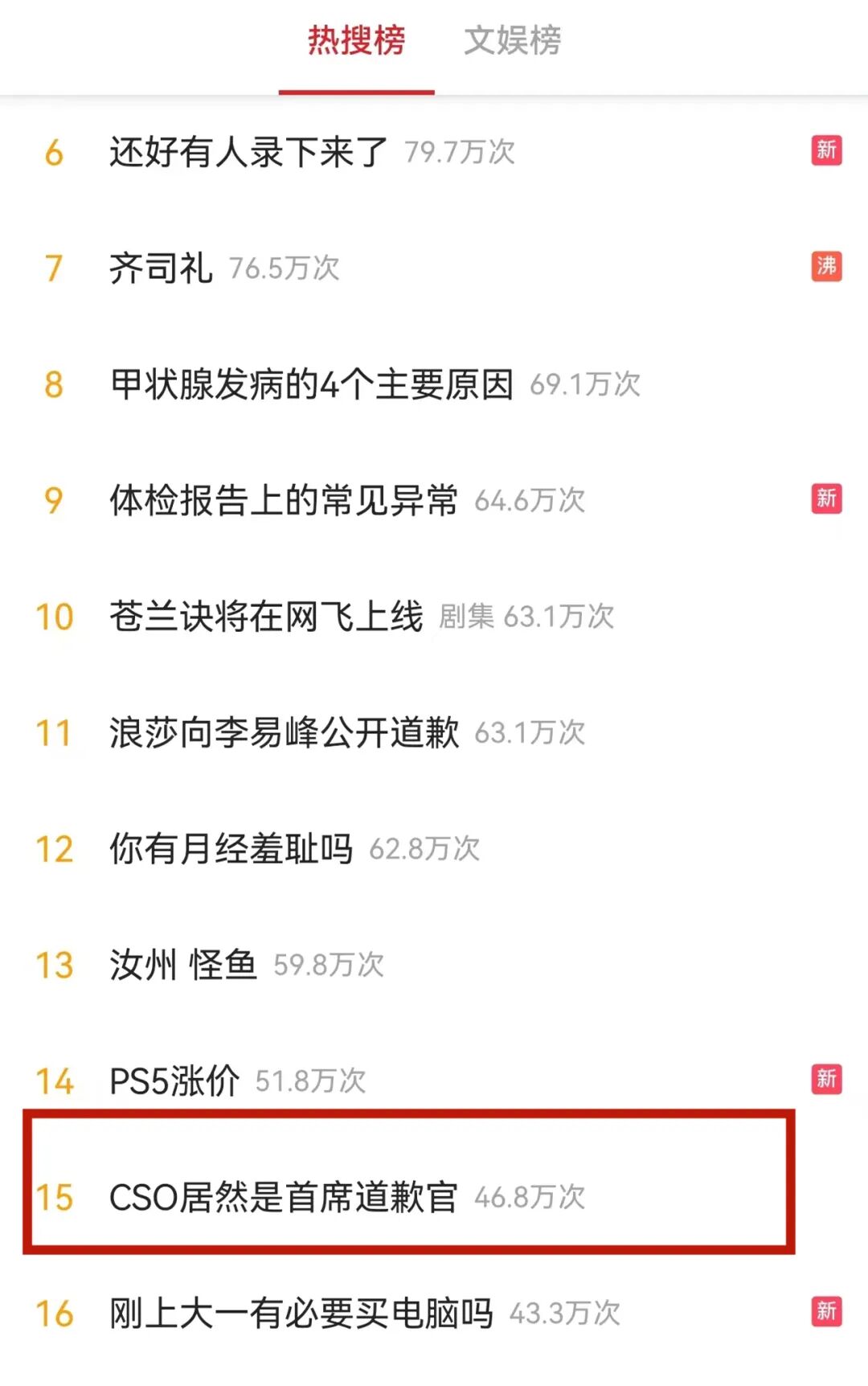 这一首次出现的“CSO首席道歉官”也登上了热搜,引起广大网友注意。