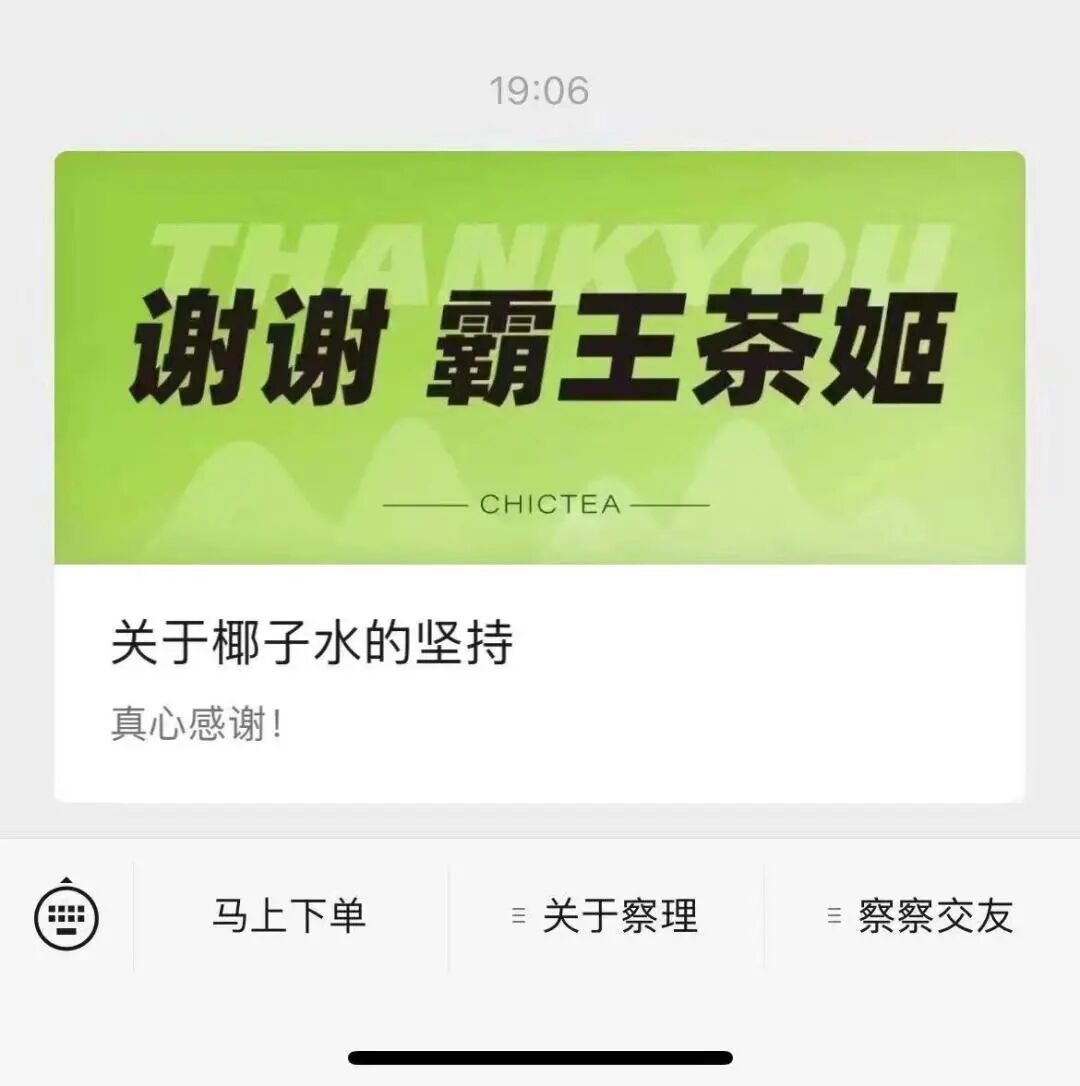 还有一件有意思的事。昨天晚上,另一个茶饮品牌察理王子也发布了一篇《关于椰子水的坚持》。文中称,看到了霸王茶姬对椰子水的道歉声明,钦佩这种本着负责任的态度而下架调整产品的做法。