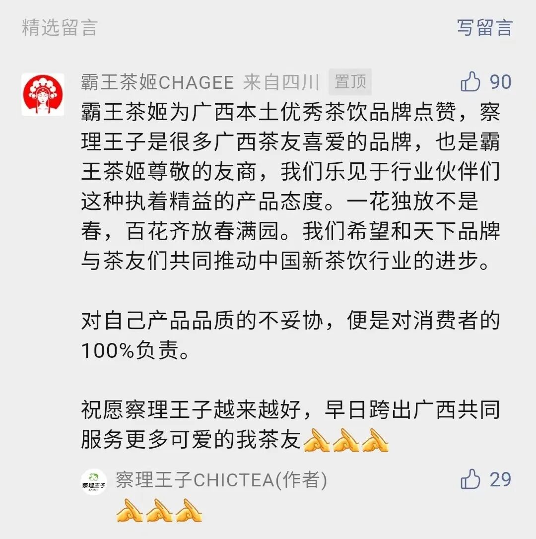 霸王茶姬官方也与之互动,表示“对自己产品品质的不妥协,便是对消费者的100%负责”。
