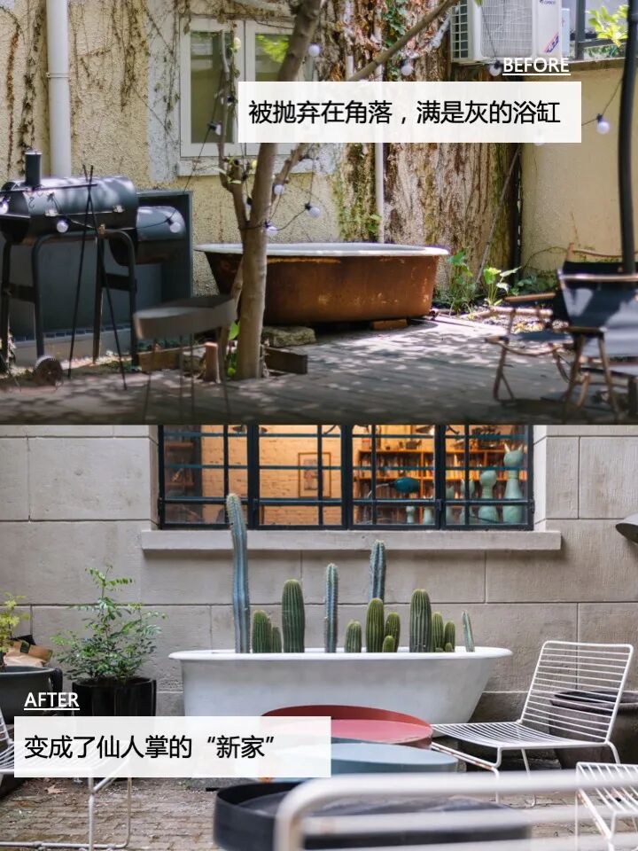 通过新增台阶式排座、利用院子里的树木做围桌、用旧浴缸打造新景观等方式,让这片小院在焕新后可以吸引和容纳更多人。