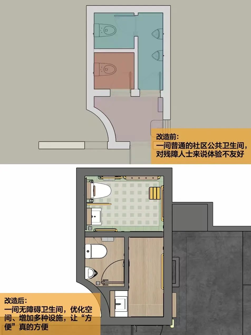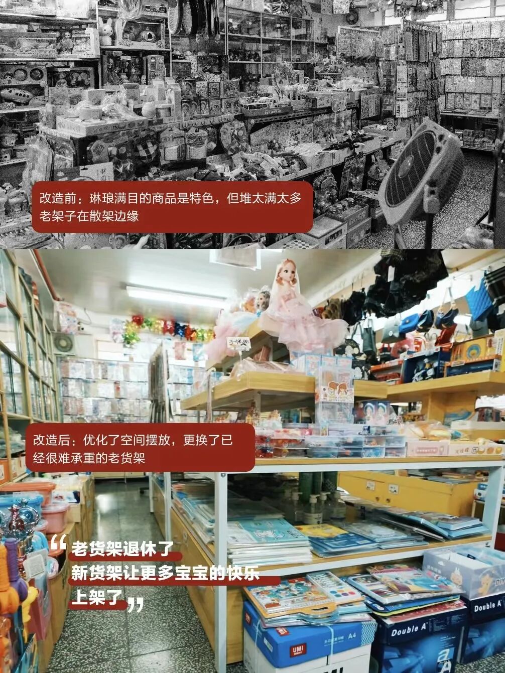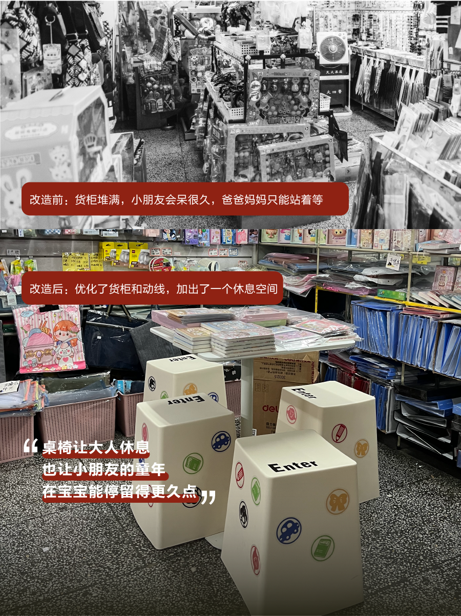 从增加一个互动招牌,到更新一些货架,再到改造一间无障碍卫生间,设计师在和店主的交流中,收获了一段段真实的生活故事,并将它们用设计语言更好地凸显。
