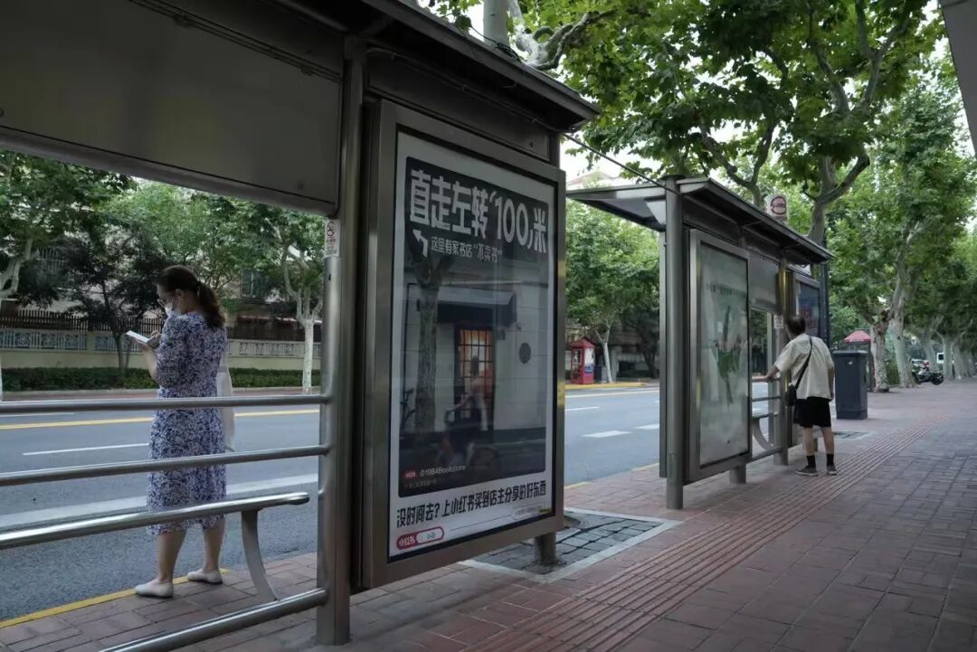 如果你去线下打卡,还会在猛一抬头间,被周边公交站点和店主门面上贴着的海报给可爱到。