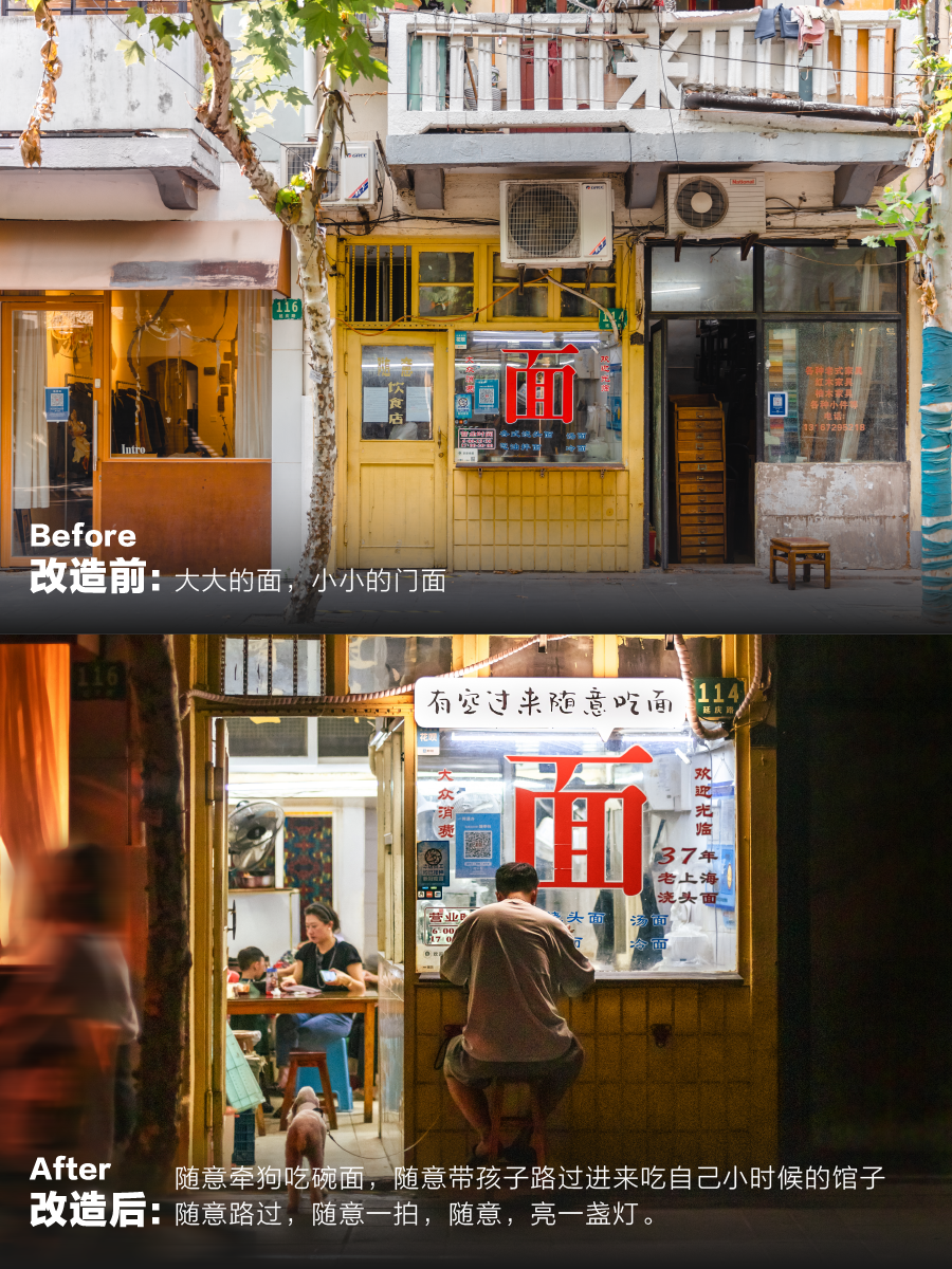 为此,在改造中,设计师经过和店主的沟通,给面馆的门头加了一个发光小灯箱,增加小店跟客人的互动感。