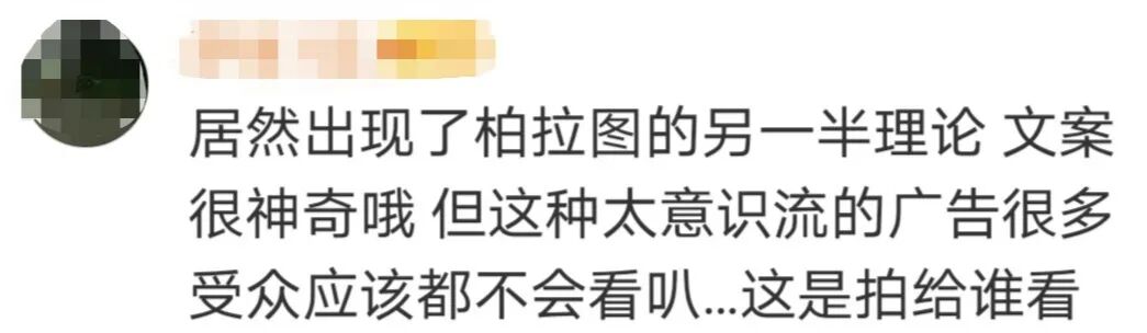 毕竟,意识流的受众群体只是小部分人群。当普罗大众面对这支广告时,可能就接收不到品牌的沟通信号,无法建立起与消费者的情感价值联系。