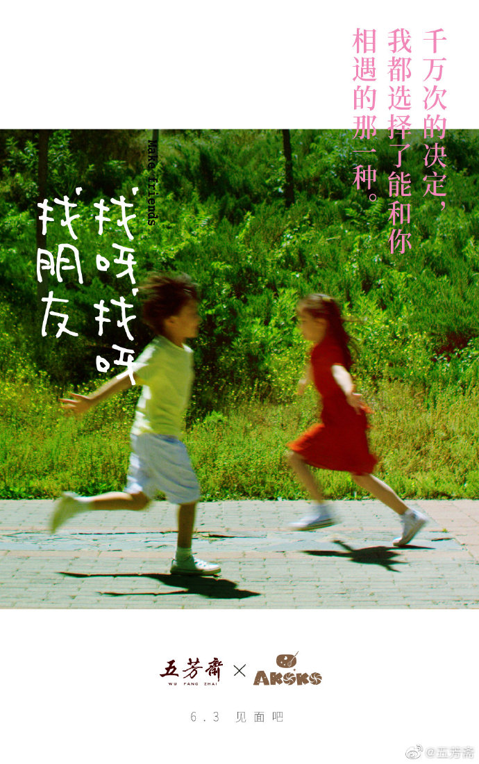 以小孩子找朋友的视觉,传递出五芳斋与AKOKO、钟薛高和拉面说的联名合作主题,充满了童趣的妙思,赋予了联名产品人格化的情感温度。
