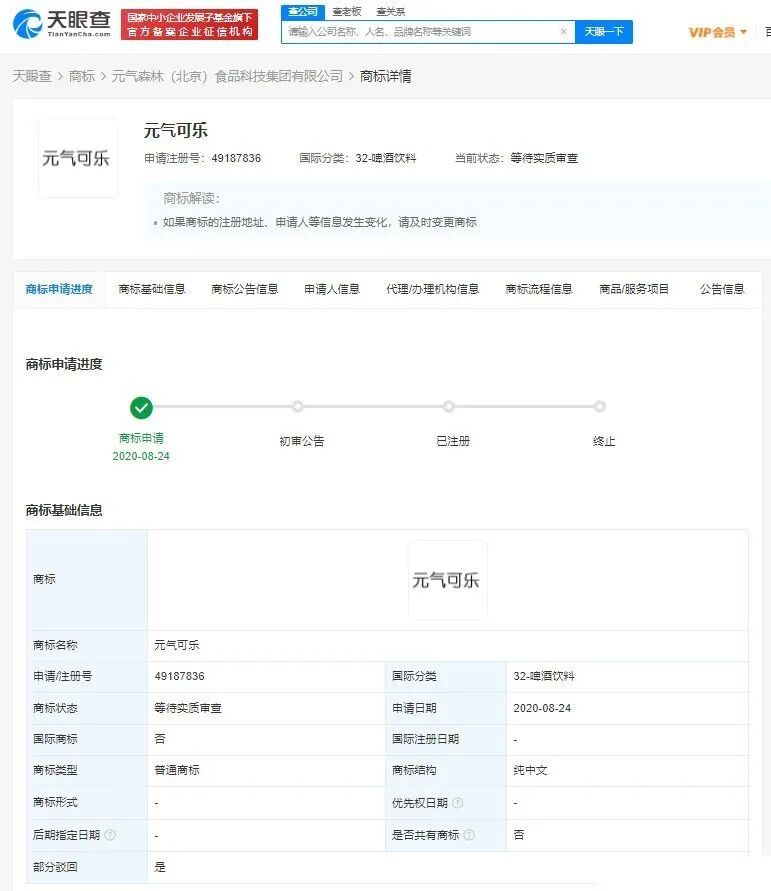 而早在去年1月份,以气泡水活跃的元气森林,也申请了“元气可乐”商标。