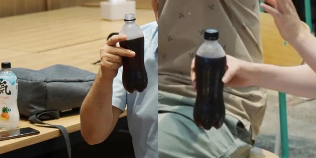 并据当时官方曝光的图来看,装着可乐液体的瓶子跟元气森林原本瓶子的设计一致,只是撕掉了瓶贴标签。