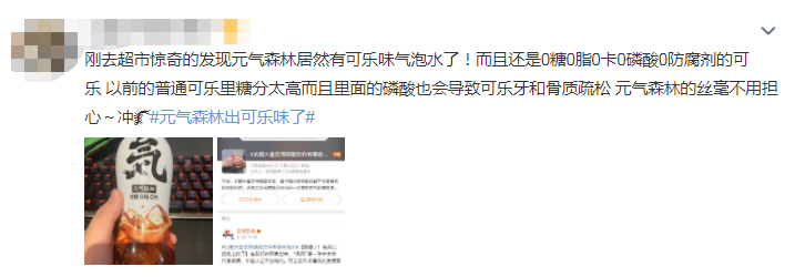 对于元气森林这款可乐味的气泡水,也引起了网友们的热议。有人觉得,相比市面上那些高糖高磷酸的可乐,元气森林这款饮品更能满足追求健康生活的需求。