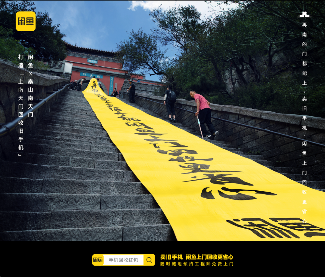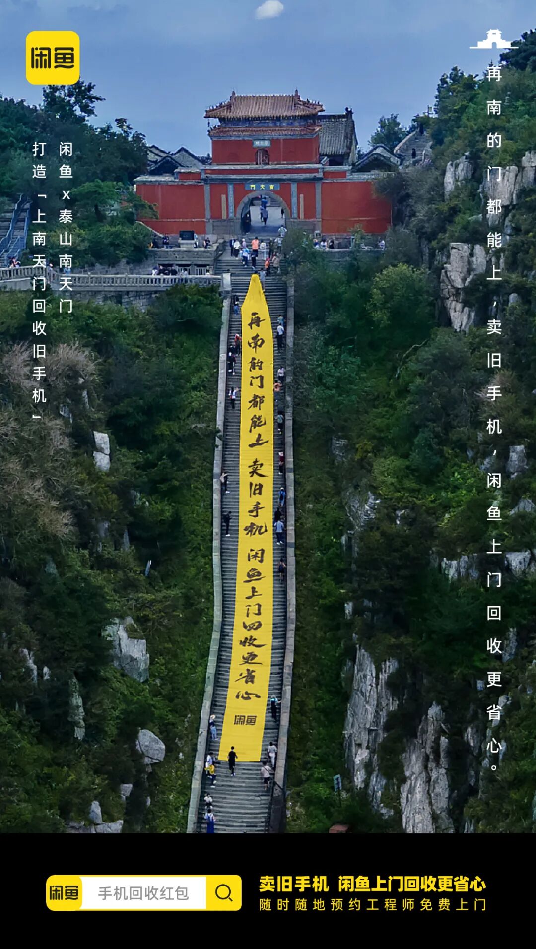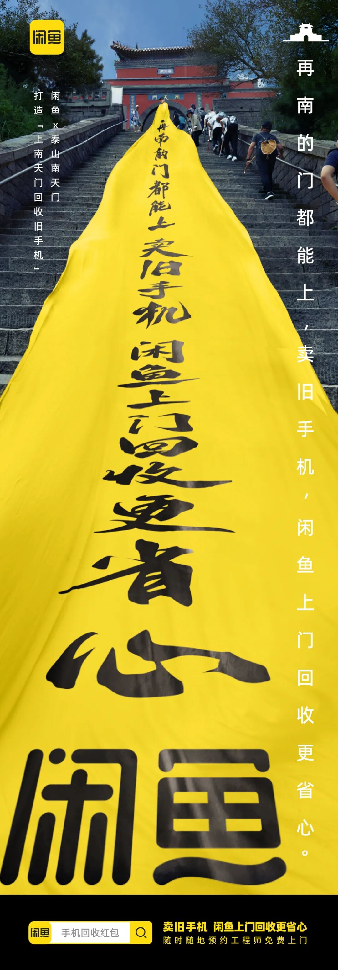 闲鱼x泰山南天门,打造「上南天门回收旧手机」线下事件,闲鱼质检工程师披着巨长披风,犹如一个公正无私的侠客,跨越数千级台阶,登上天下第一山泰山,以此体现闲鱼手机上门回收的靠谱和公平公正公道。